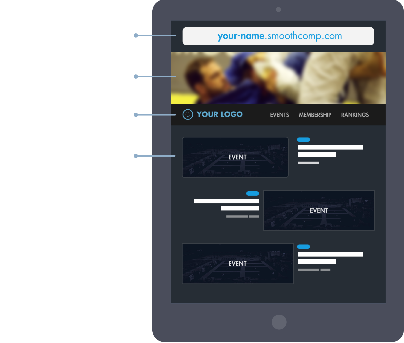 For federations and companies running several tournaments we can provide you with your-name.smoothcomp.com. On this customizable page you can gather all administration for your academies and tournaments in one place.